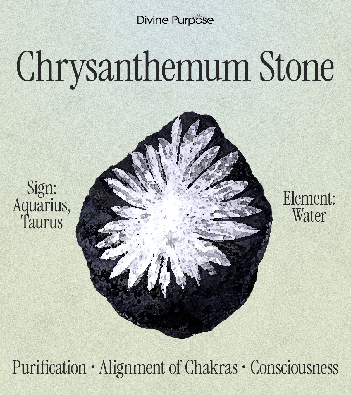 It looks like a flower fossilized in midnight — white petals blooming through ancient stone. Born over 290 million years ago from ocean mud and fire, Chrysanthemum Stone carries the memory of becoming — the patience of unfolding in divine time.