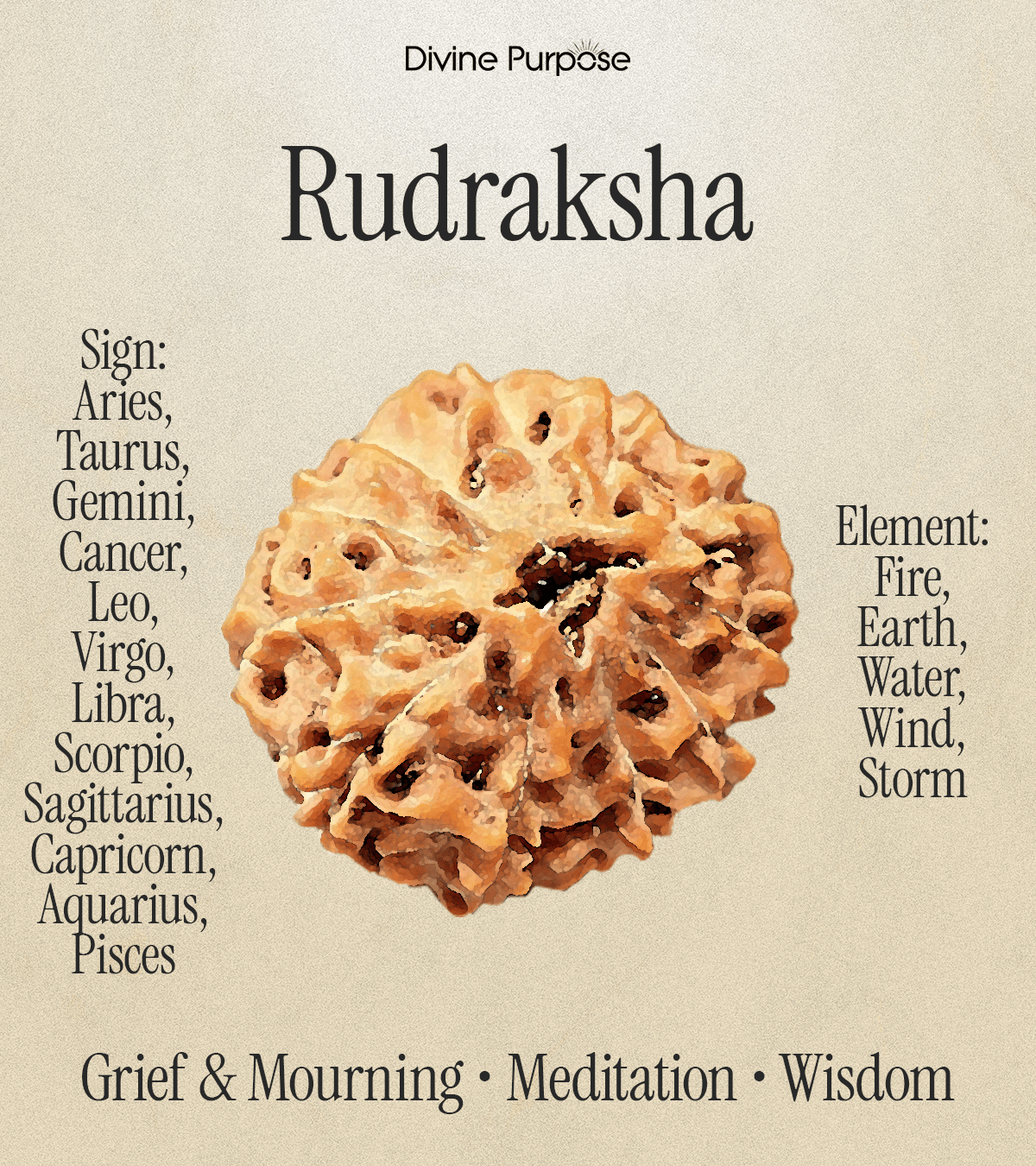 Rudraksha has traveled through history as a companion to seekers, sages, and anyone who wanted to feel closer to both themselves and the divine. Followers of Lord Shiva use these beads in meditation to tap into creation and destruction, life and letting go. The seed is alive with possibility, reminding us that grief, wisdom, and renewal can coexist. It helps you hold the heaviness without collapsing, to sit with absence without fear, and to notice the small sparks of vitality that are always around you.