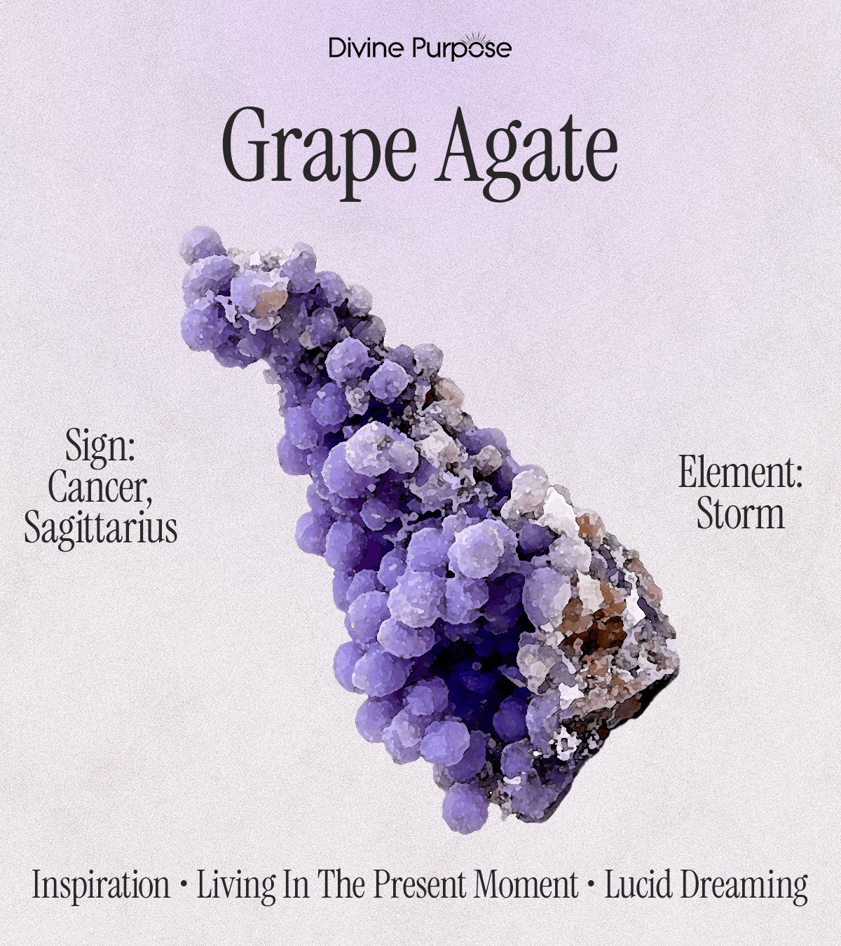 Placing Grape Agate near your bed encourages lucid dreaming—dreams become clearer, more controllable, and insightful. Meditating with it enhances your ability to bridge the realms of imagination and reality, helping you live with heightened awareness and a connection to your higher self.